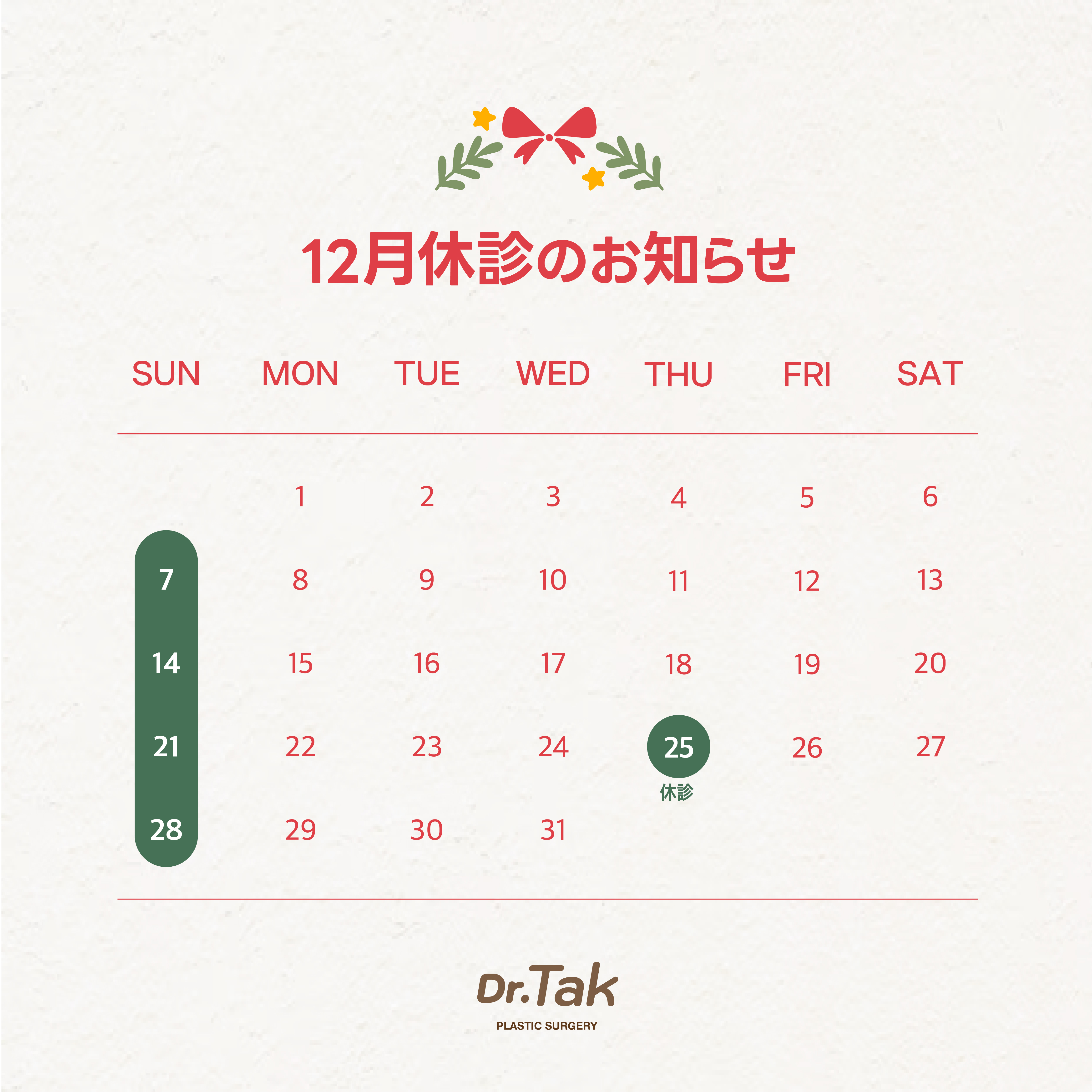 日曜日、祝日は休診しております。